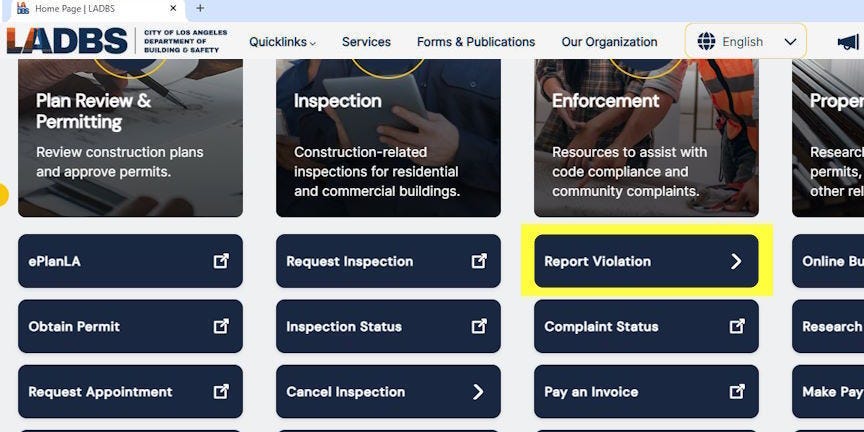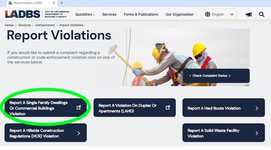 The next step is to access the LADBS website at dbs.lacity.gov. Scroll down the page, look for the box titled “Enforcement,” and click on “Report Violation” (outlined in yellow). You can also check on the status of your complaint, once filed, and make a public record request for the inspection case file.