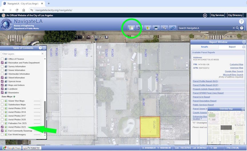 The NavigateLA site is useful for finding addresses based on a visual search of the city. To make your search easier, I suggest you click on Table of Contents (green circle) and then check the box under Table of Contents (green arrow) to display an aerial photo over the map. The aerial photo provides more visual clues to help you identify the building of concern.