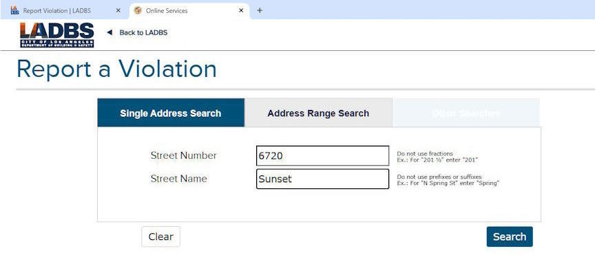 The LADBS website will take you to a form where you must conduct an address search. You may search either by entering a single address or by entering a range of addresses. The number and street name are entered separately, do not enter prefixes.