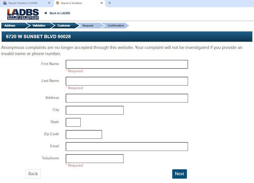 LADBS requires you to provide your name and phone number in order to accept a complaint filed online. Information regarding your address and email is optional. LADBS has a legal obligation to protect your identity within reason, but your identity can be discovered via legal filings or court order.