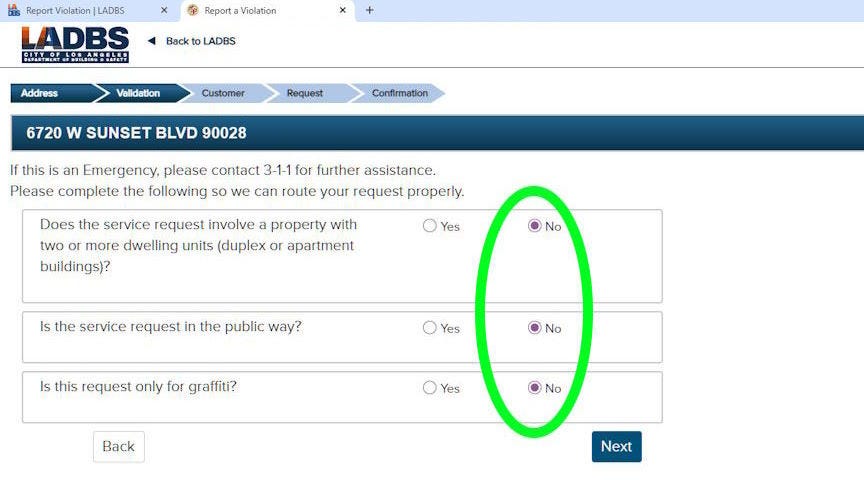 After you enter the street address, street name, and click search, you will be asked three questions about your complaint. To reach the LADBS, the proper answer to all three questions is “No.” If you answer “Yes,” your complaint will be directed to another city agency.