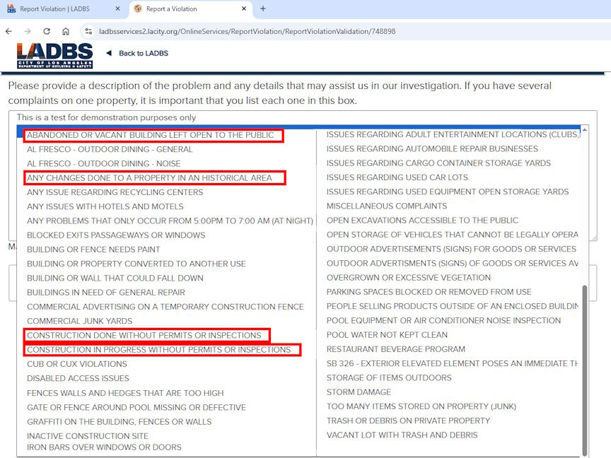 For example, if your request only involves graffiti, you will be directed to MyLA311 where you can file a service request for abatement. The LADBS will not open a case file, as they are not responsible for graffiti abatement (though graffiti can be a clear sign that the building is vacant and a target for demolition by neglect).